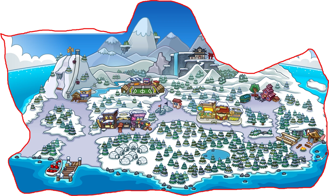 Club Penguin Island is a very large island, due to the high amount of servers installed. The main places in Club Penguin are the "Town" & the "Plaza", where there are 3 shops in the area. Other places are the Dock, Beach & Ski Village. Many games can also be played, which should be visible on the map. Here are some of the many places on the island. A map is shown below.