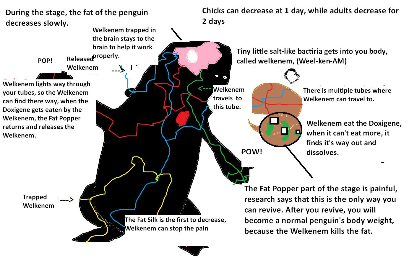 A Comparison of a Normal penguin and a Fat penguin. The fat penguin is suffering from phase IV of the symptoms.