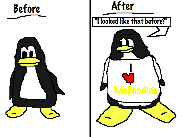 Comparison of a normal penguin (before) and a fat penguin (after). The fat penguin is suffering from phase III of the symptoms.