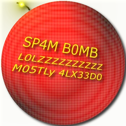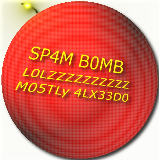 Spam Bombs are a type of grenade that uses wikicode to erase 2,350 HP from all targets and spam the victim with str00del l33t. It's red with yellow letters that say: "SP4M B0MB. L0LZZZZZZZZZZ M05TLy 4LX33D0." Nobody has the slightest idea what that means except Str00dels. It contains over 9,000 lines of computer code and is surprisingly lightweight for all the code it contains.