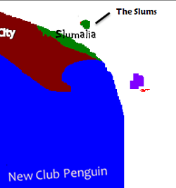 The Slums is a run-down city full of alleyways and poor appartments which penguin hobos with no home come to stay. It wasn't the government's choice for the place of alleyways to be made, it was numerous penguins choice. This rundown excuse for a city is in fact the capital of the wannabe nation of Slumolia and is laden with Str00dels.